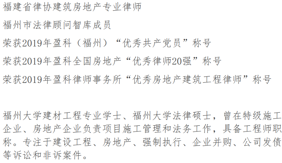 榮譽:2018年福州市律師協會“首屆福州市青年律師模擬法庭大賽”第二名,賽事”優秀代理人”、?入選福建省第四期優秀青年律師人才庫