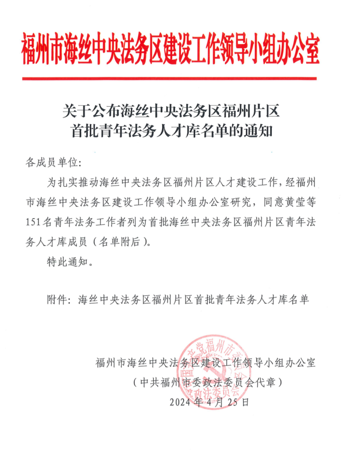 福州律師資訊:海絲中央法務區福州片區首批青年法務人才庫名單正式發布! 福州律師資訊發布者 福州律師網2024年4月28日為扎實推動海絲中央法務區福州片區人才建設工作,經福州市海絲中央法務區建設工作領導小組辦公室研究,同意黃瑩等151名青年法詳情