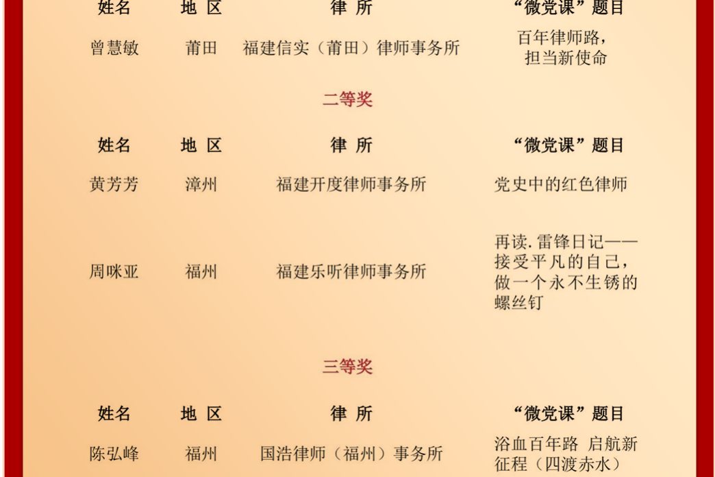 福州市律師協會:喜報!我市3部“微黨課”作品獲獎 福州律師資訊發布者 福州律師網2024年12月2日2024年9月,福建省律師協會黨建工作委員會在全省律師行業基層黨組織中開展“微黨課”(線上)競賽活動。參賽選手們結合自身詳情