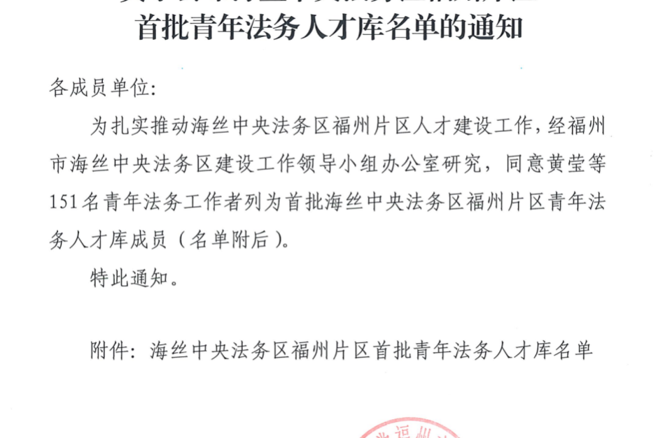 福州律師資訊:海絲中央法務區福州片區首批青年法務人才庫名單正式發布! 福州律師資訊發布者 福州律師網2024年4月28日為扎實推動海絲中央法務區福州片區人才建設工作,經福州市海絲中央法務區建設工作領導小組辦公室研究,同意黃瑩等151名青年法詳情