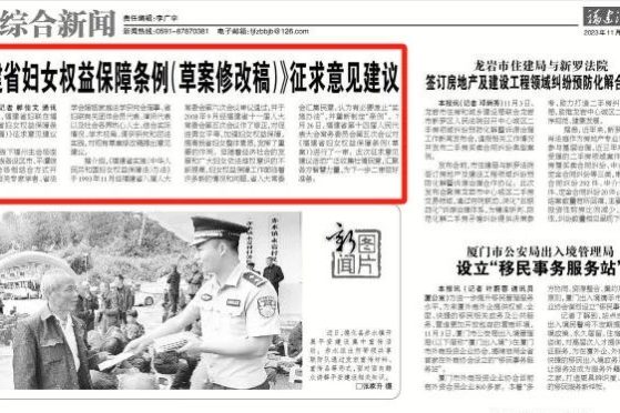 盈科福州律師接受工人日報采訪解讀《福建省婦女權益保障條例》 福州律師資訊發布者 福州律師網2024年4月15日近日,福建省人民代表大會常務委員會公告,《福建省婦女權益保障條例》自2024年6月1日起施行。 該條例第六章第四十五條明詳情