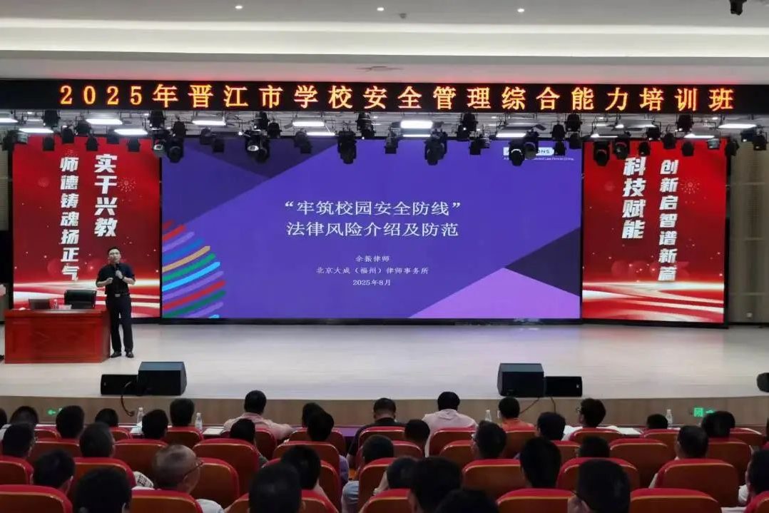 大成福州律師受邀為“2025年晉江市學校安全管理綜合能力培訓班”開展專題分享 福州律師資訊發布者 福州律師網2025年8月28日2025年8月26日,由晉江市教育局主辦、北京聯合保險經紀福建省分公司承辦的“2025年晉江市學校安全管理綜合能力培訓班詳情