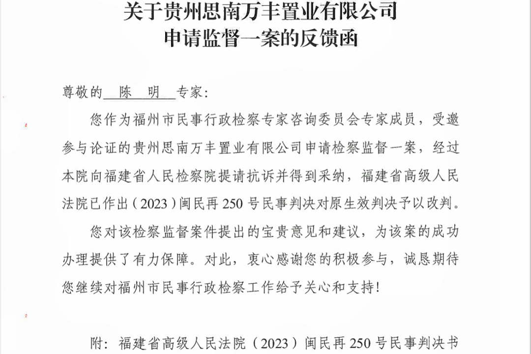 福州律師資訊: 福州市人民檢察院向錦天城·福州發(fā)來案件感謝反饋函 福州律師資訊發(fā)布者 福州律師網(wǎng)2023年9月20日近日,上海錦天城(福州)律師事務所收到福州市人民檢察院發(fā)來的《有關貴州思南萬豐置業(yè)有限公司申請監(jiān)督一案的反饋函》,對錦天詳情